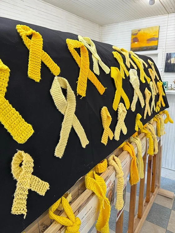 This community project was created by a mother-daughter duo, Camille and Anya Davidson. Camille and Anya, dual citizens of Israel and America, were inspired by the stitch them home idea, a community-led project using knitted or crocheted yellow ribbons to call for the release of the hostages taken from Israel on October 7th, 2023. After months of feeling hopeless and distraught, they decided to channel their sorrow into creativity and advocacy. The exhibit is to bring awareness to the continued plight of the hostages and their families after nearly 2 years. There are still 50 hostages in Gaza—on display are their pictures along with a few words about them. Anya and Camille launched this project by gathering friends to knit and crochet while learning more about the hostages and the efforts to bring them home. Each ribbon is lovingly created with them in mind. We cannot forget about them and their families.